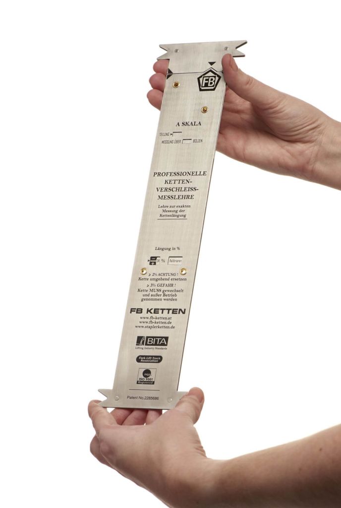 The chain must be clean and the measurement must be made at a load of approximately 1 % tensile strength. If tension weights are not available, it is sufficient for lifting chains if the chains are preloaded with a normal load from the weight of the goods being transported or forks.