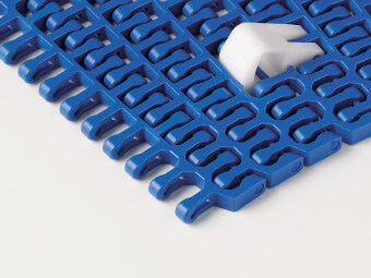 Separate elements that are located on the top of the modular belt. Pop-up flight pops up at the foot of the conveyor incline to support the food as it moves up the elevator, holding it steady. Then, once the product has been successfully discharged, the flight pops down again so an automatic scraper can clean up the belt – especially helpful for sticky, clingy food products. It is simple to fit the Pop-up flight to the existing uni modular belt system – no secondary drive motors or complex controls are needed. It is also easy to maintain, and it contributes significantly to plant hygiene. |