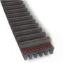 The toothed side of the belts can be in HTD or STD profile. Depending on the required power transmission, they are available in standard design with glass-cord tension member, in reinforced design (CXP), or – on request – with aramid tension member (CXA). The ribbed belt side is in PK profile with a rib spacing of 3.56 mm. These are very special belts, produced only in a few defined lengths and widths, determined by the number of ribs.