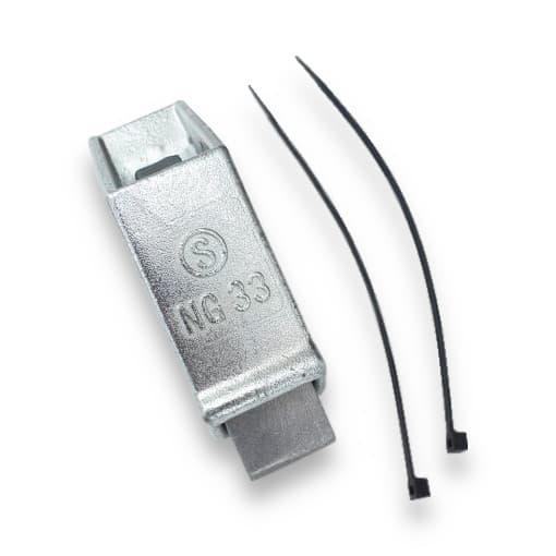 ZV 040 K0 GEO (for CONTI POLYFLAT, for External Screw M16) are wedge sockets used for fastening CONTI POLYFLAT flat belts and CONTI POLYROPE elevator belts. They consist of a cast iron housing in which the flat belt is inserted and secured with a special wedge against loosening. Depending on the method of attachment, they can be fixed with a bolt or with a bolt and a spring.